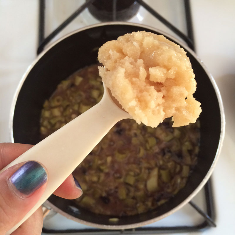 - Add blueberries and honey and let cook 3 more minutes. (The honey I used is actually raw honey that crystallized during freezing temps. That’s why it looks more like a chunk of butter than clear syrup.)